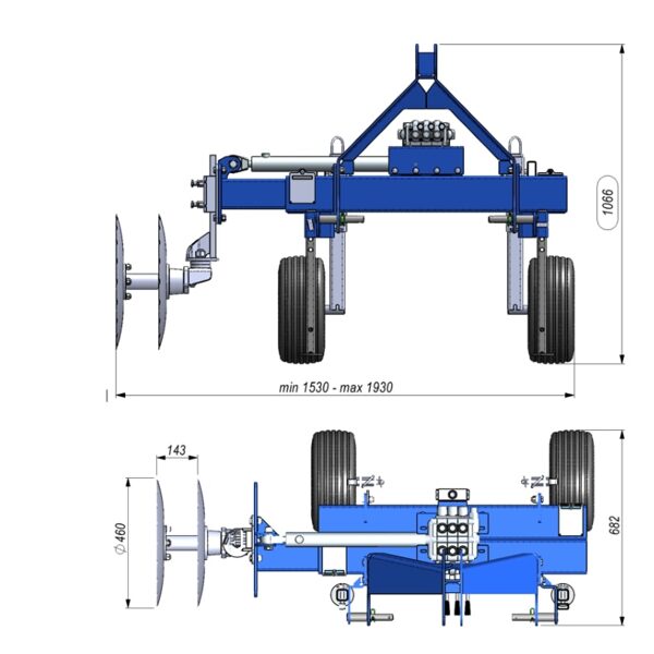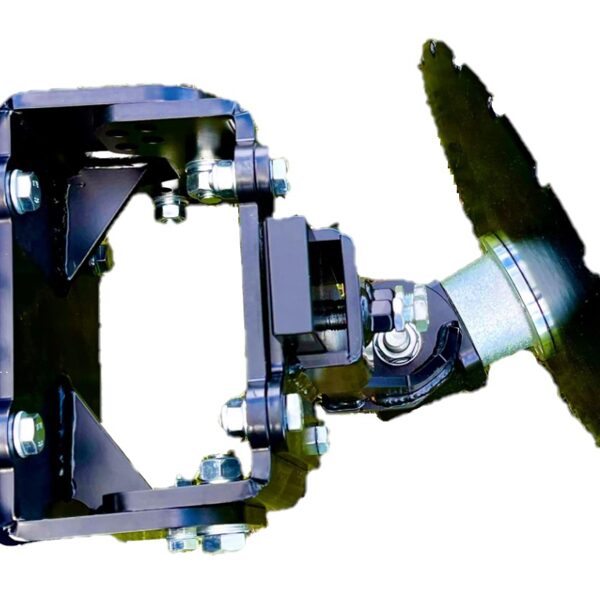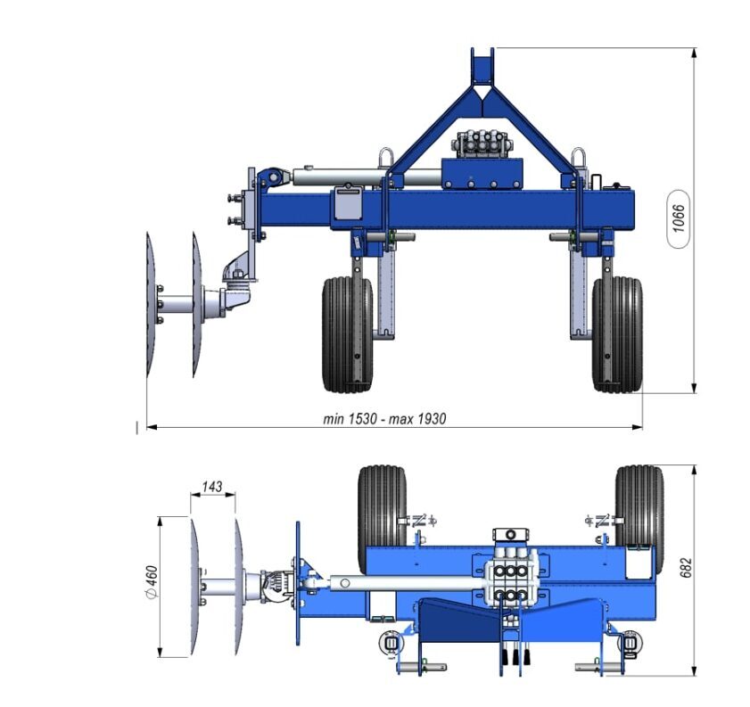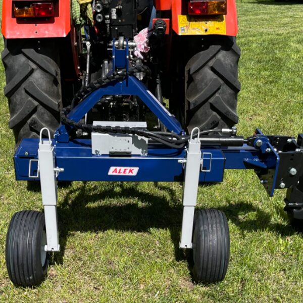 - Apgriežama šasija ir uzstādāma traktora aizmugurē vai priekšā, savienota ar 3 punktu uzkari CAT 1, 2